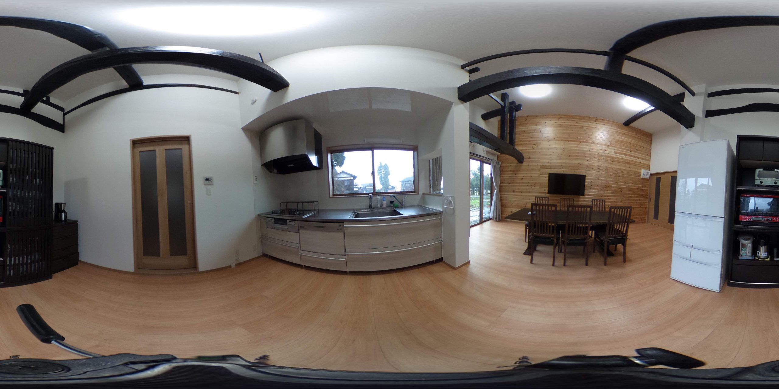キッチンの天井を高くする為に、今まで天井裏に隠れていた梁をリファインして『表し梁』とし、天井、壁、梁が単調にならないようアクセントとして温かみのある、杉の羽目板で仕上げました。